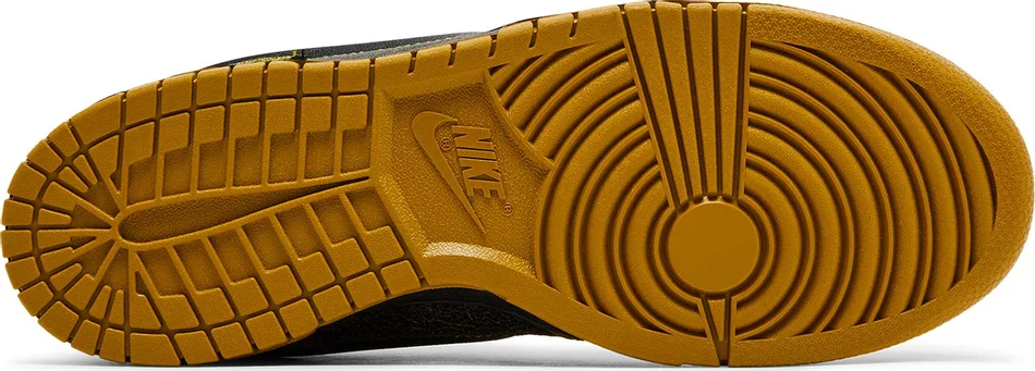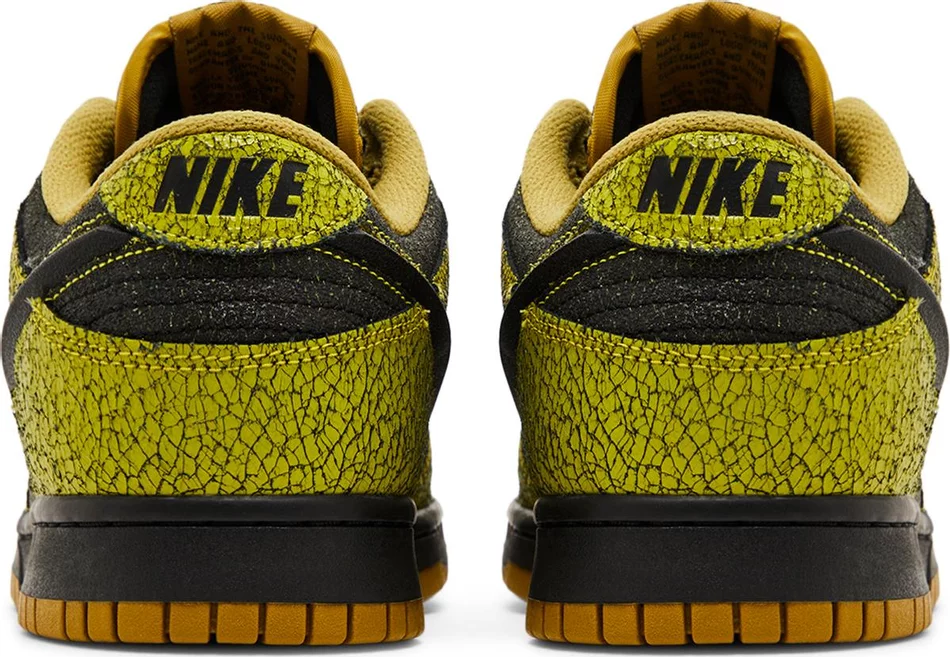 The Nike Dunk Low 'Halloween Skull' updates the retro hoops shoe with a cracked leather upper, featuring a black base color with contrasting green overlays at the forefoot and heel. Outlined in contrast green stitching, a molded black Swoosh sweeps across the side panel, while an embossed skull graphic decorates the toe box. Inside the shoe, additional skull imagery adorns the custom sockliner. The sneaker rests on a solid black midsole, supported underfoot by a rubber outsole in Green Curry.