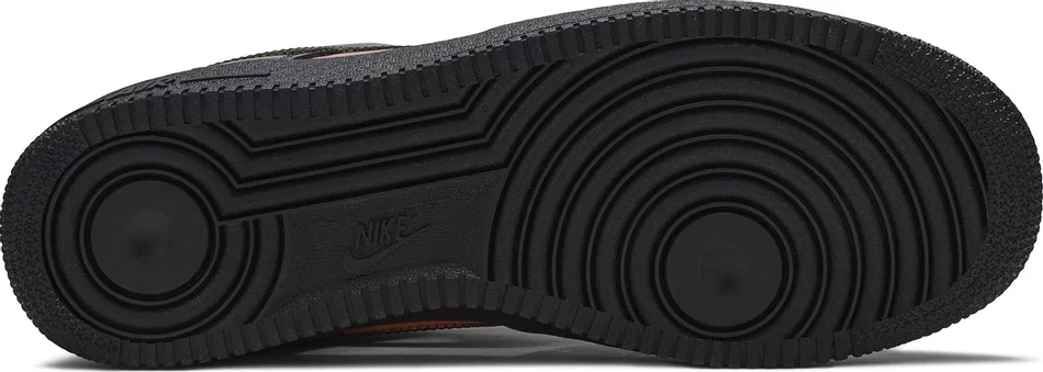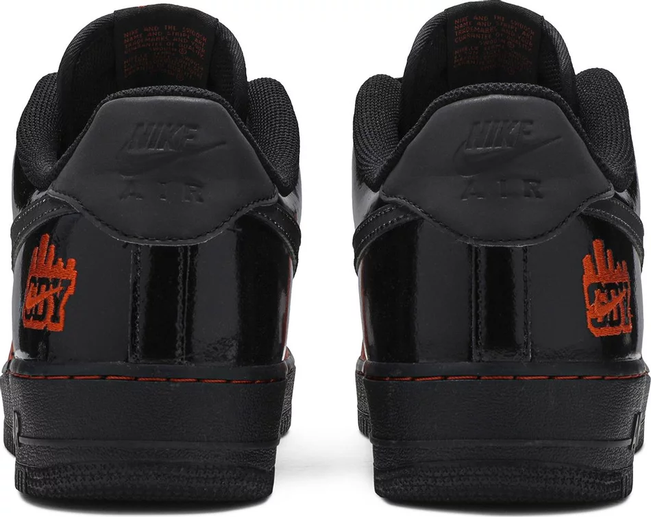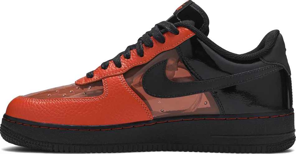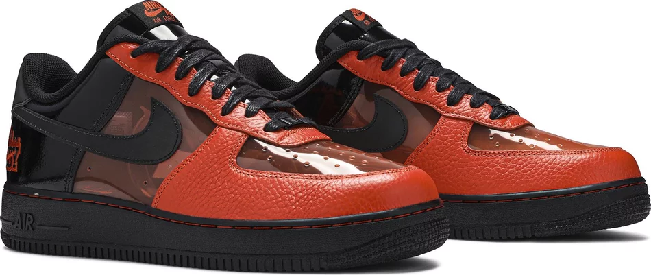 Unveiled in October 2019, the Nike Air Force 1 Low 'Shibuya Halloween' sneaker draws inspiration from the Tokyo district's annual costume street party. Patent leather and orange tumbled leather split the upper, with transparent inserts representing the bags that litter the streets after the event. The ward's skyline and acronym are embroidered on the heel. Its black rubber midsole carries bright stitching and an Air unit under the heel.
